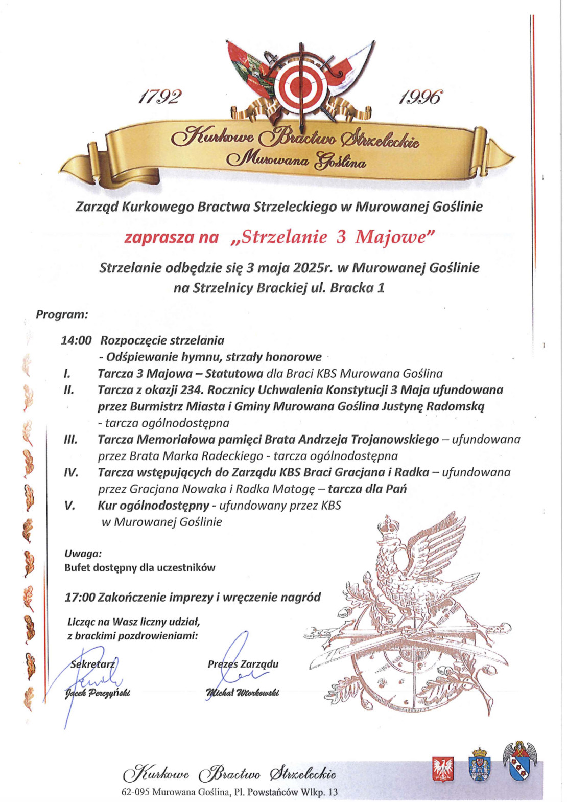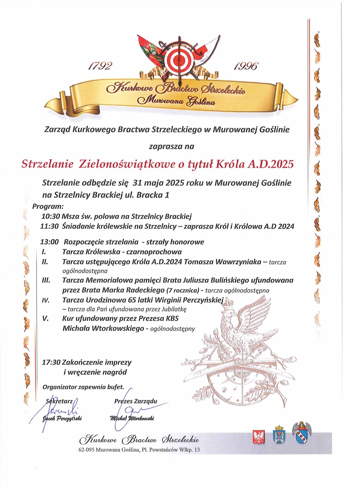 Zarząd Kurkowego Bractwa Strzeleckiego w Murowanej Goślinie zaprasza na Strzelanie Zielonoświątkowe o tytuł Króla A.D. 2025