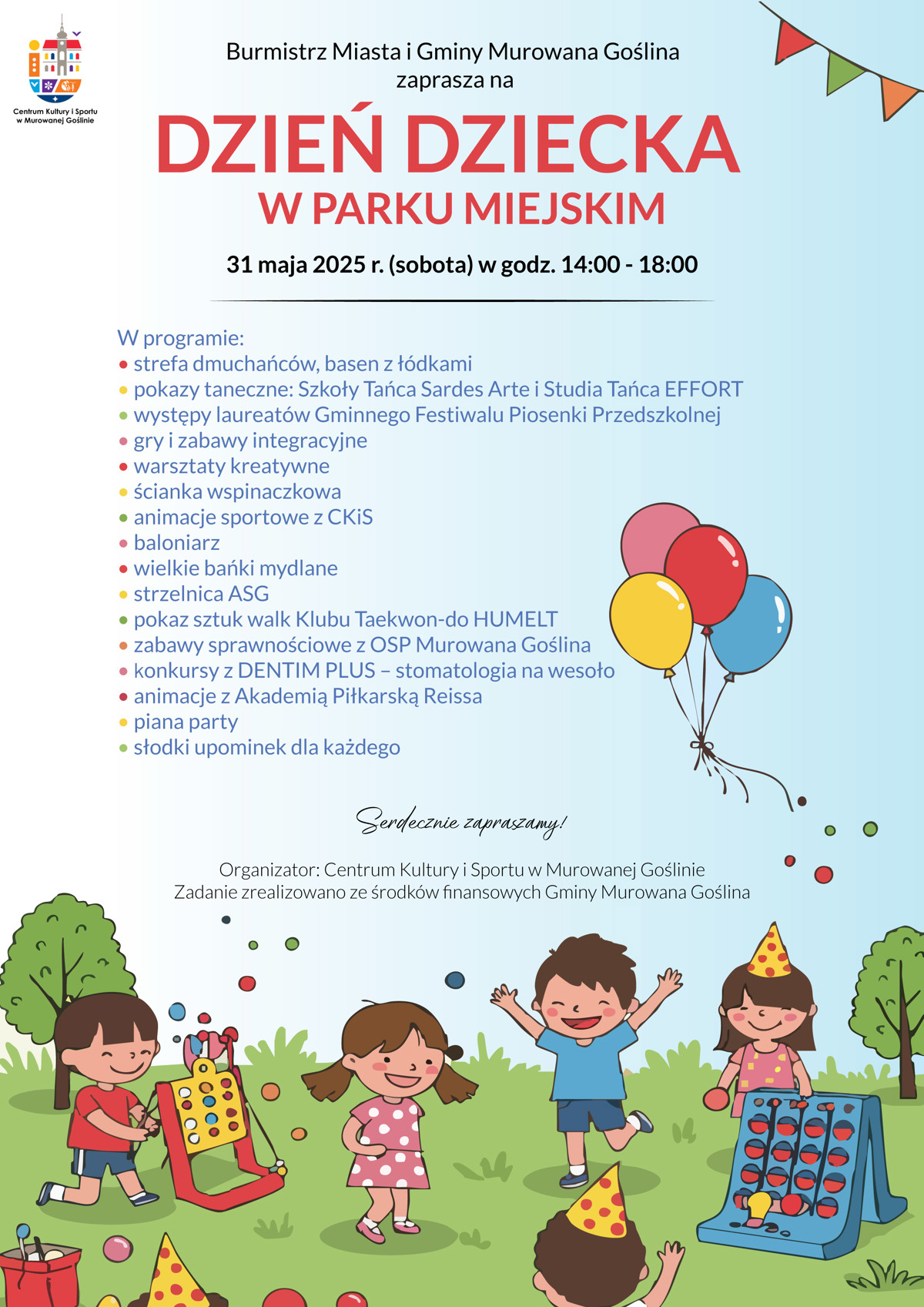 31 maja 2025 r. (sobota) w godz. 14.00 - 18.00 Dzień Dziecka w Parku Miejskim.